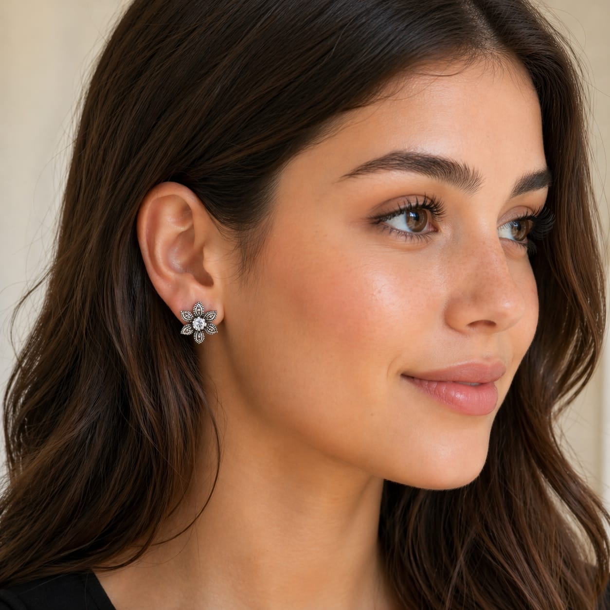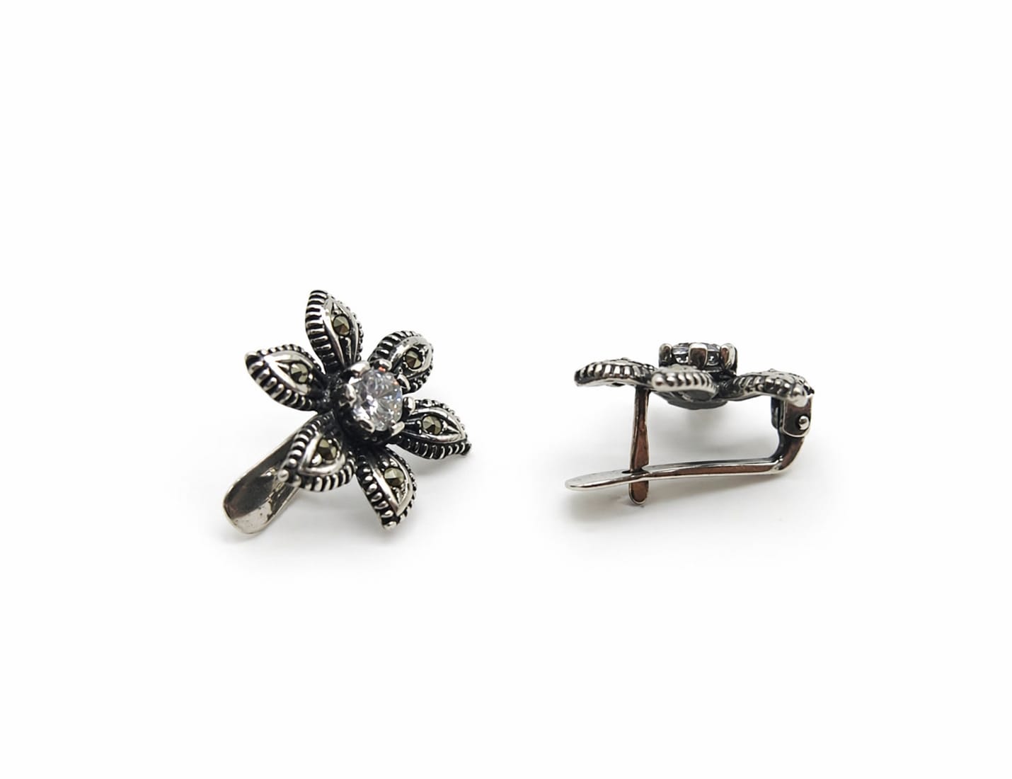 Brincos Flor com Marcassites e zirconias com fecho de segurança escape
